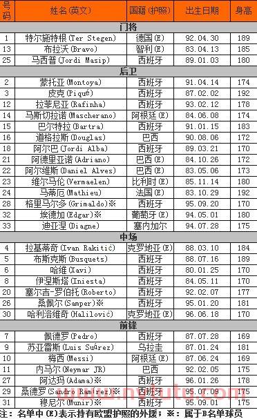 普约尔、3皮克、2阿尔维斯、21阿德里亚诺、丰塔斯中场:16布斯克茨、14马斯切拉诺、6哈维、4法布雷加斯、8伊涅斯塔、15凯塔、7蒂亚戈、20阿费莱前锋:11内马尔、17佩德罗、10梅西、9桑切斯这是目前巴萨官网上给出的名单。